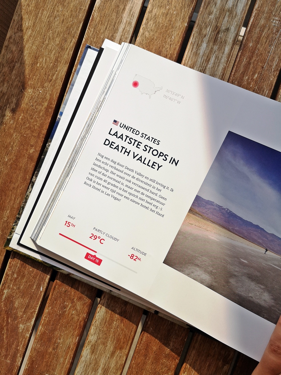 De kosten van je fotoboek hangen af van het aantal pagina’s en variëren van €30 tot €80. Voor mijn maand Amerika kwam ik in de categorie van €60, al had het zeker beknopter gekund. De kwaliteit is uitstekend: het is mooi, stevig papier, de foto’s zijn scherp en de kaft is ook heel sterk. Je moet wel even geduld hebben, want de levertijd is zo’n 2 á 3 weken. Maar dan heb je ook wat! Ik heb er inmiddels al 3 in m’n kast staan; ook Cuba en Zwitserland prijken op m’n boekenplank.